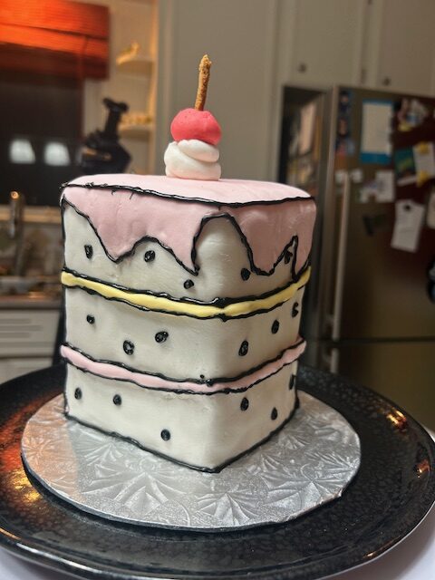 Episode 1 featured Liam Charles’s Cartoon Cake- a peanut butter cake decorated with fondant and royal icing to look like a cartoon animation. I made this for my birthday in 2025, and will soon post more photos, descriptions and recipes for how I veganied the bake, and a video chronicling my process. For now, here is a photo of the completed cake. I am quite pleased with it!